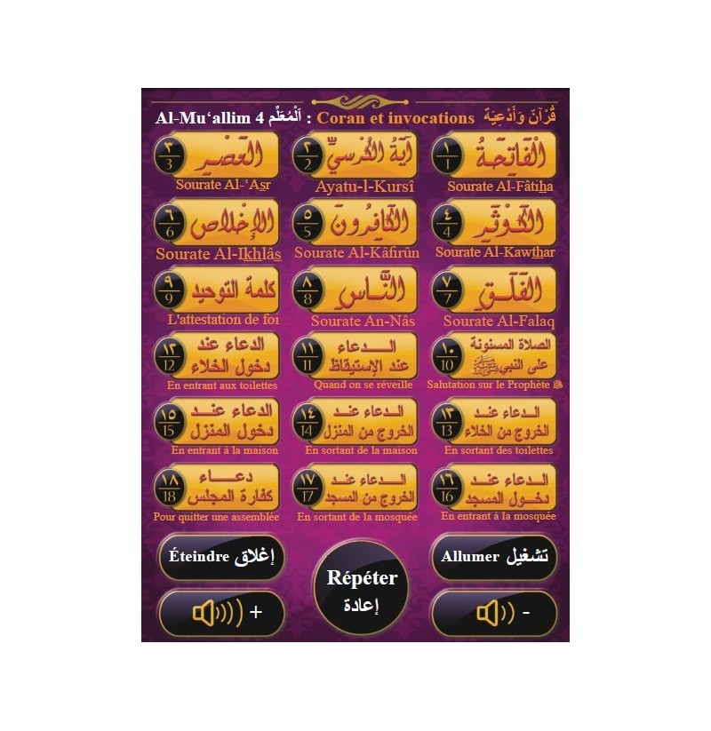 Une Mini Tablette islamique avec plusieurs sourates du Saint Coran et invocations (dou’as). Au total 18 boutons permettent d’écouter les sourates et les invocations + 4 boutons pour le réglage du volume, de répétition et de mise en marche. Une très bonne manière de faire apprendre le Saint Coran à vos enfants de manière ludique.